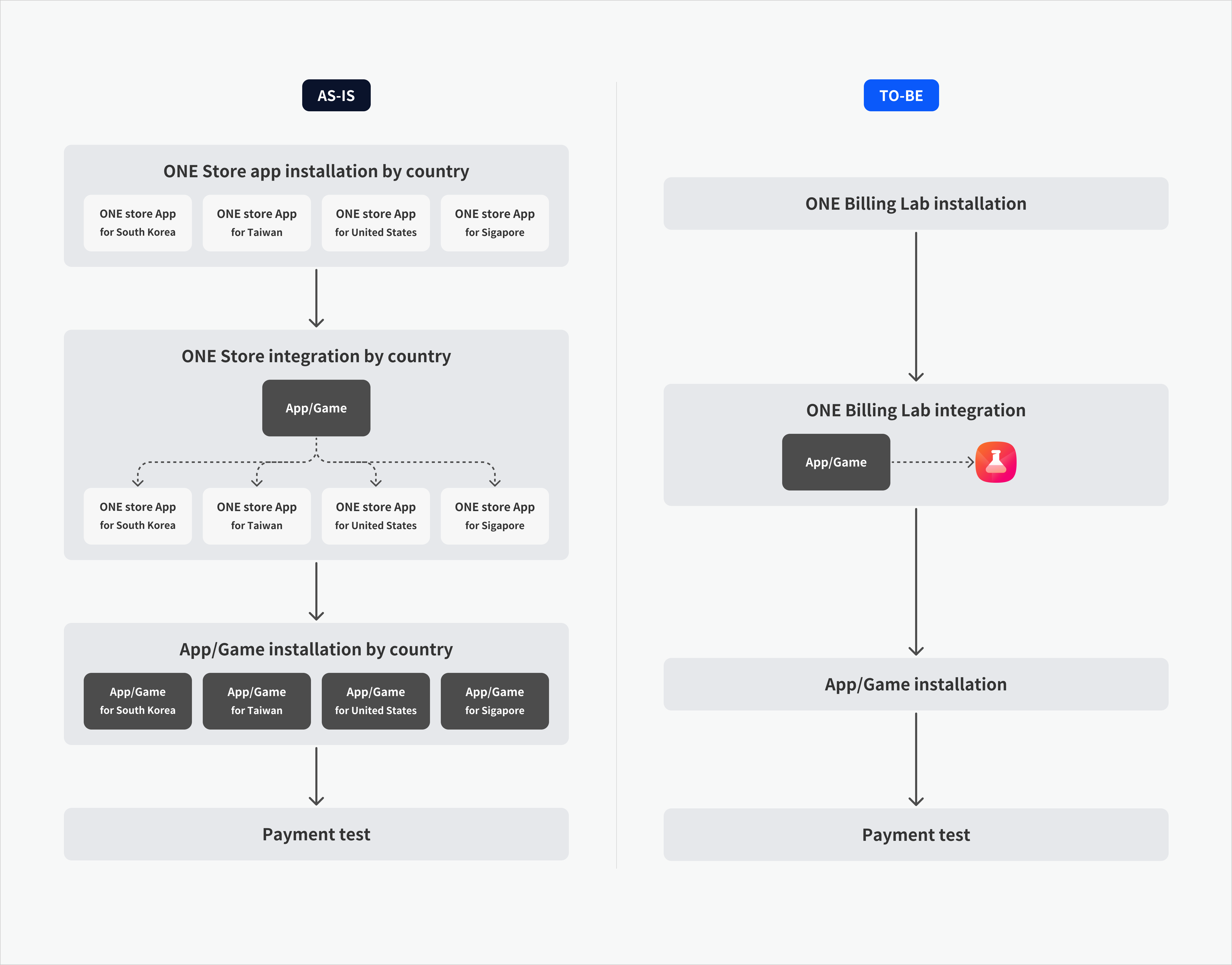 #### 📌 ONE Billing Lab作为研发工具，可以帮助研发人员更容易确认ONE store服务各国家In-App支付库综合状态。