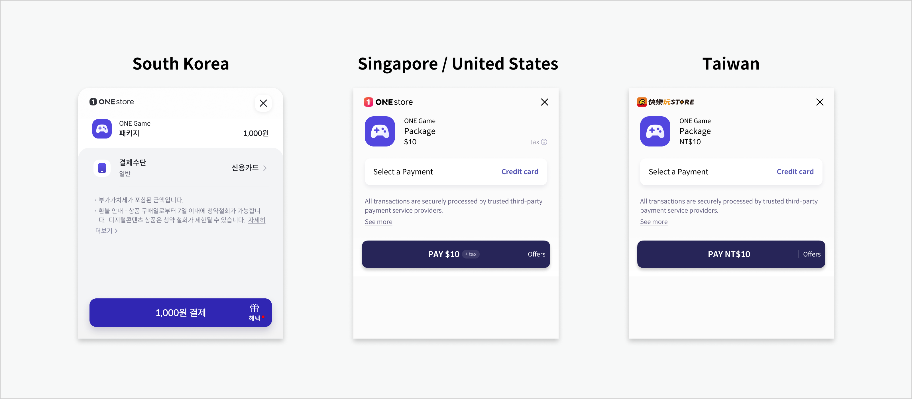 * 按照注册ONE store账户的国家和研发者中心设置的支付环境基准，显示支付画面。