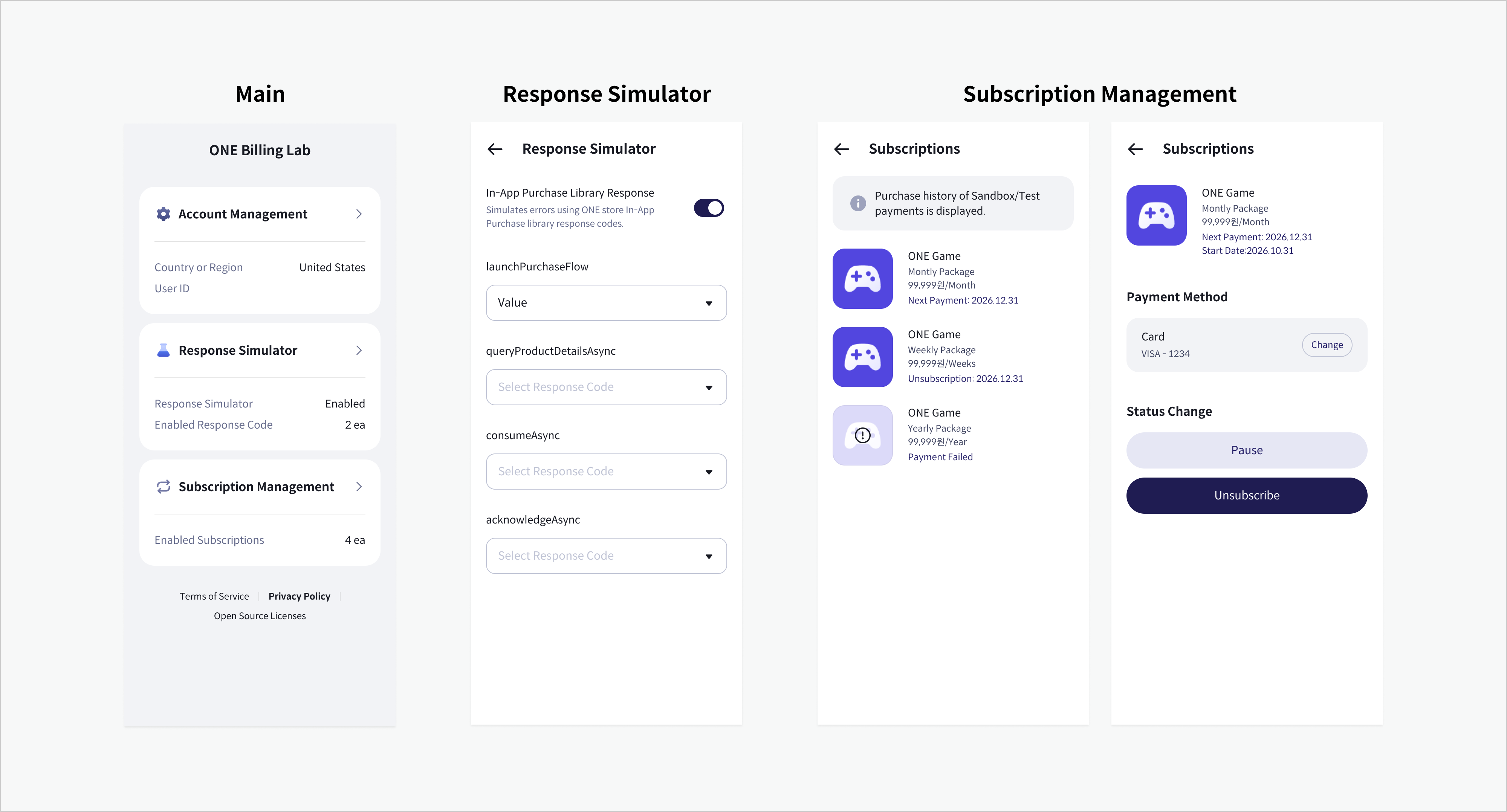* 没联动实际ONE store支付系统，也可以通过ONE Billing Lab的响应模拟程序功能测试支付流程。