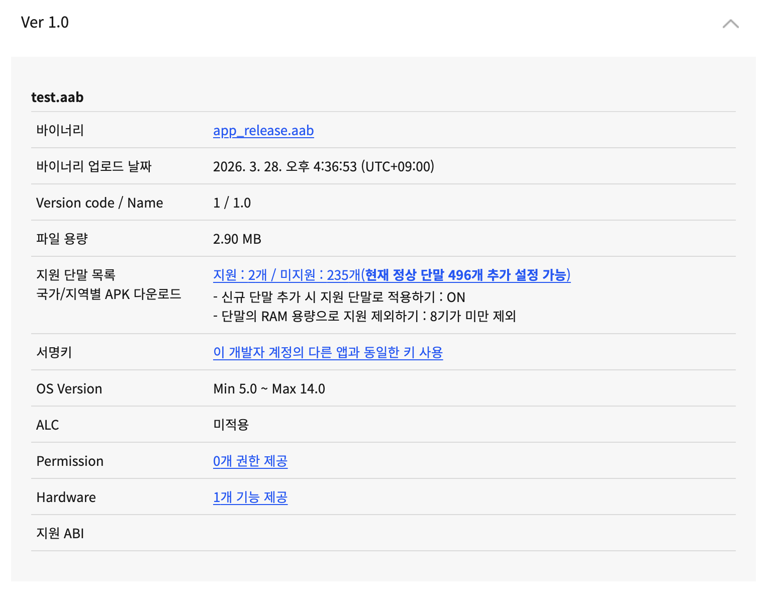 AAB만 등록하더라도, 범용 APK에 대한 빌드 및 설치 테스트를 함께 진행하여, AAB 미지원 단말에서의 호환성을 사전에 확인하는 것을 권장합니다.
